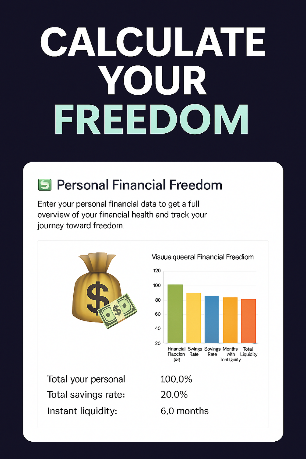 You'll Get 🚀 Instant Financial Freedom Score 💸 – Know exactly where you stand. Savings & Liquidity Insights 💰 – See how long your money can last. Clear Visual Reports 📊 – Easy-to-read charts & metrics. Smart Action Tips 🧠 – Steps to hit 100% financial freedom faster. Secure Premium Access 🔐 – Exclusive tools, just for you.