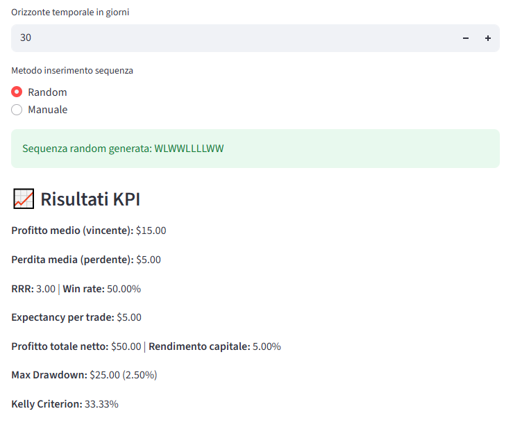 Simulatore per Statistiche di Trading e investimenti KPI con Equity Curve (ITALIANO)