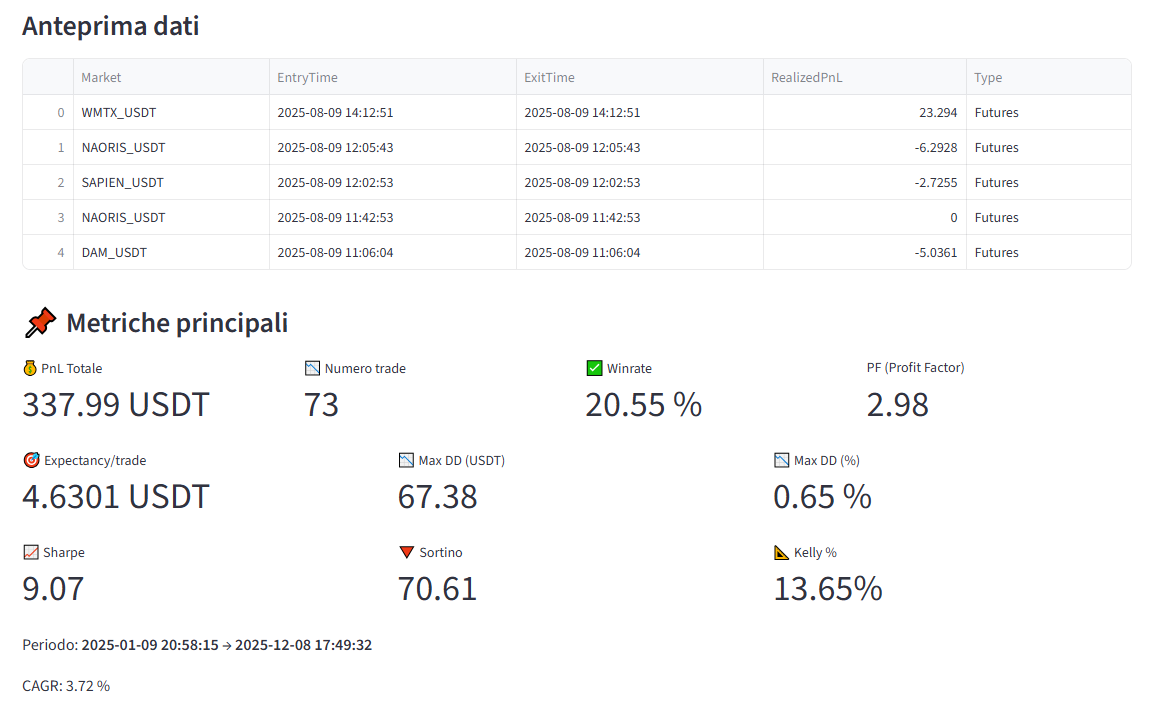 • Visualizzare PnL, equity curve, drawdown, expectancy, profit factor, Sharpe e Sortino ratio.